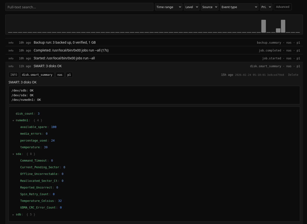 nux is a new part of my self-hosted infrastructure that ingests events (and provides notifications). It’s a perfect fit to track disks health.